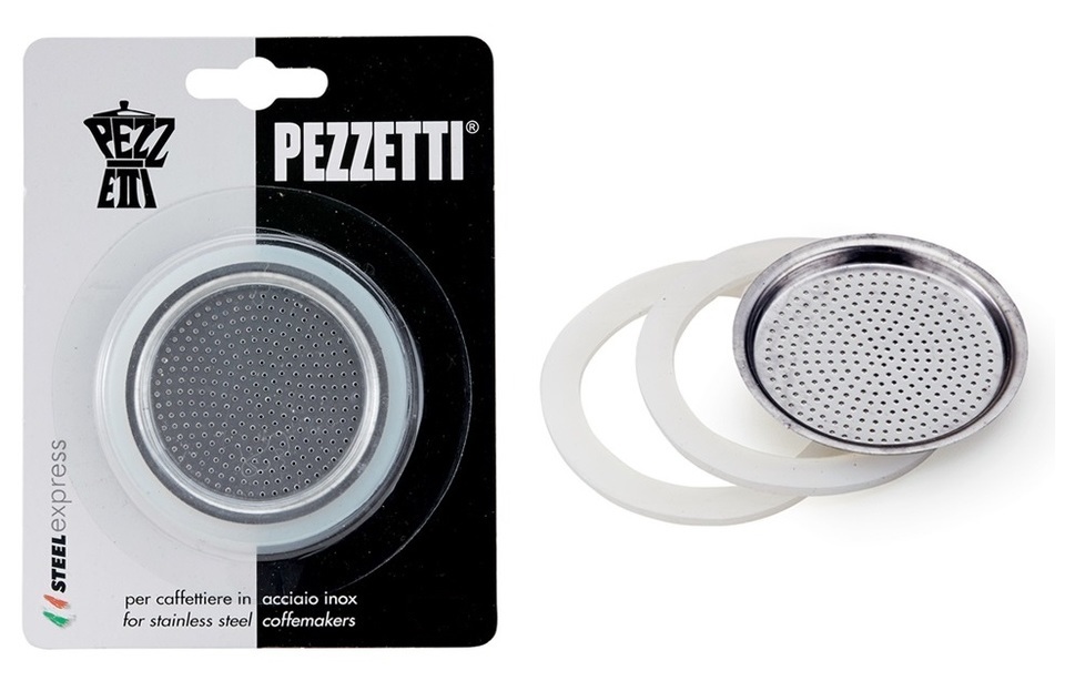 Replacement seal and filter pack for the Pezzetti stainless steel and other stove-top espresso maker.