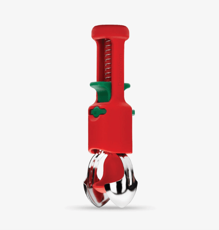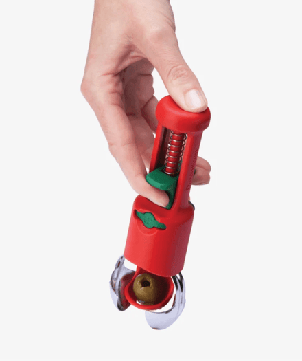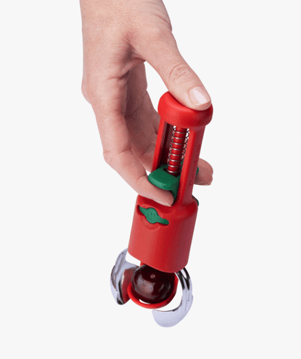 In one smooth action, Hullapit pits all sizes of cherries and olives with its spring-loaded plunger, catches their stones and pits, then releases them.