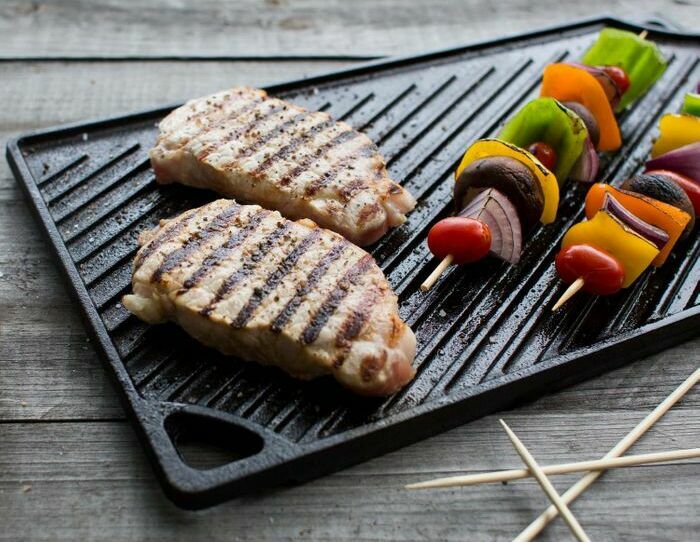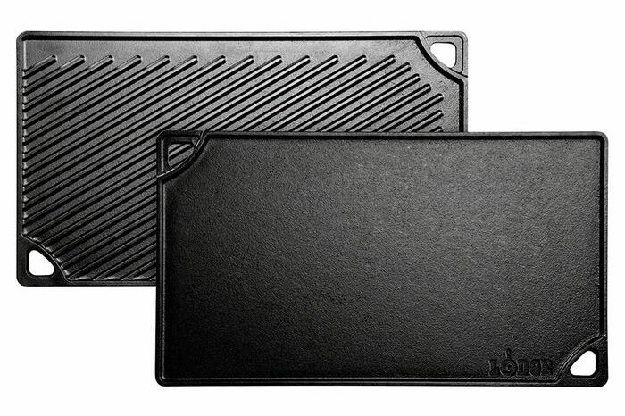 The cast iron reversible griddle covers two burners. Restaurant quality grill marks on one side and an essential griddle for big breakfasts or seared vegetables on the other!