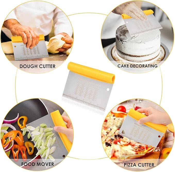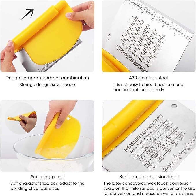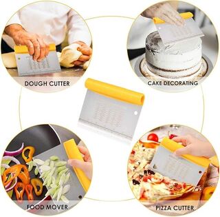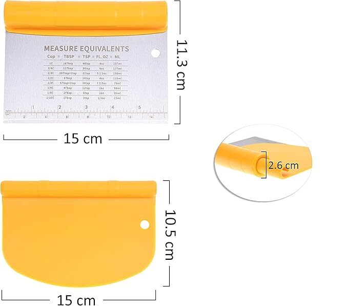 Includes a metal scraper with measurement equivalents that you can also use to cut and chop all sort of foods.